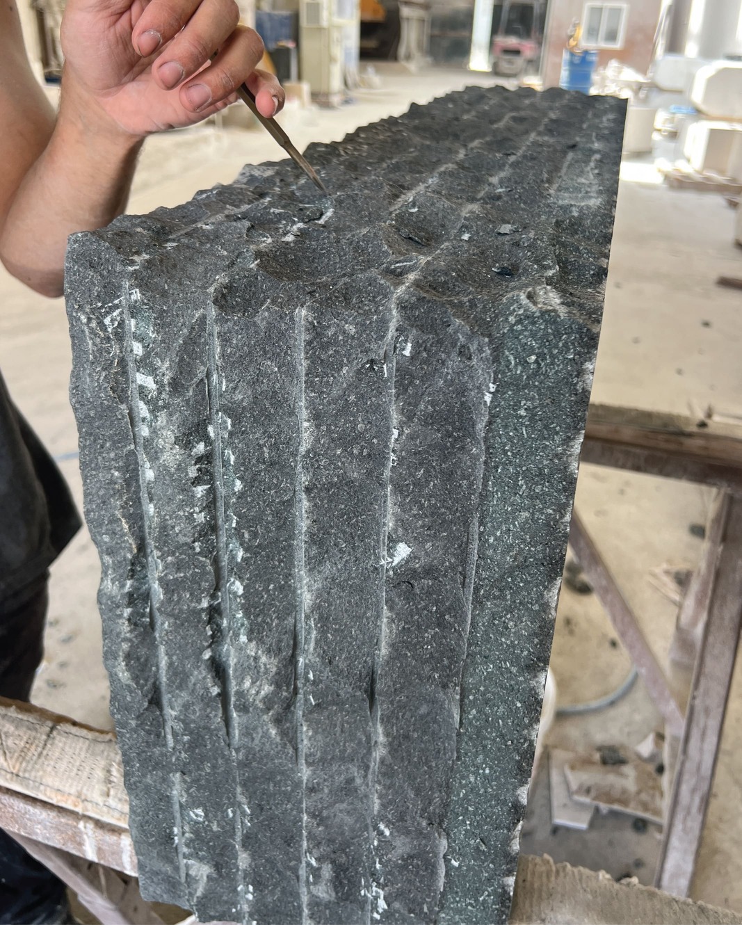 O basalto português destaca-se pela cor preta uniforme e estrutura densa. Minimalista e contemporâneo, funciona tão bem em revestimentos quanto em bancadas esculpidas, bancos ou objetos de corte preciso. Uma pedra para projetos de linguagem limpa e firme.