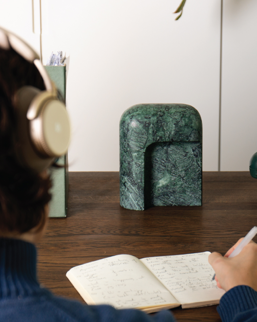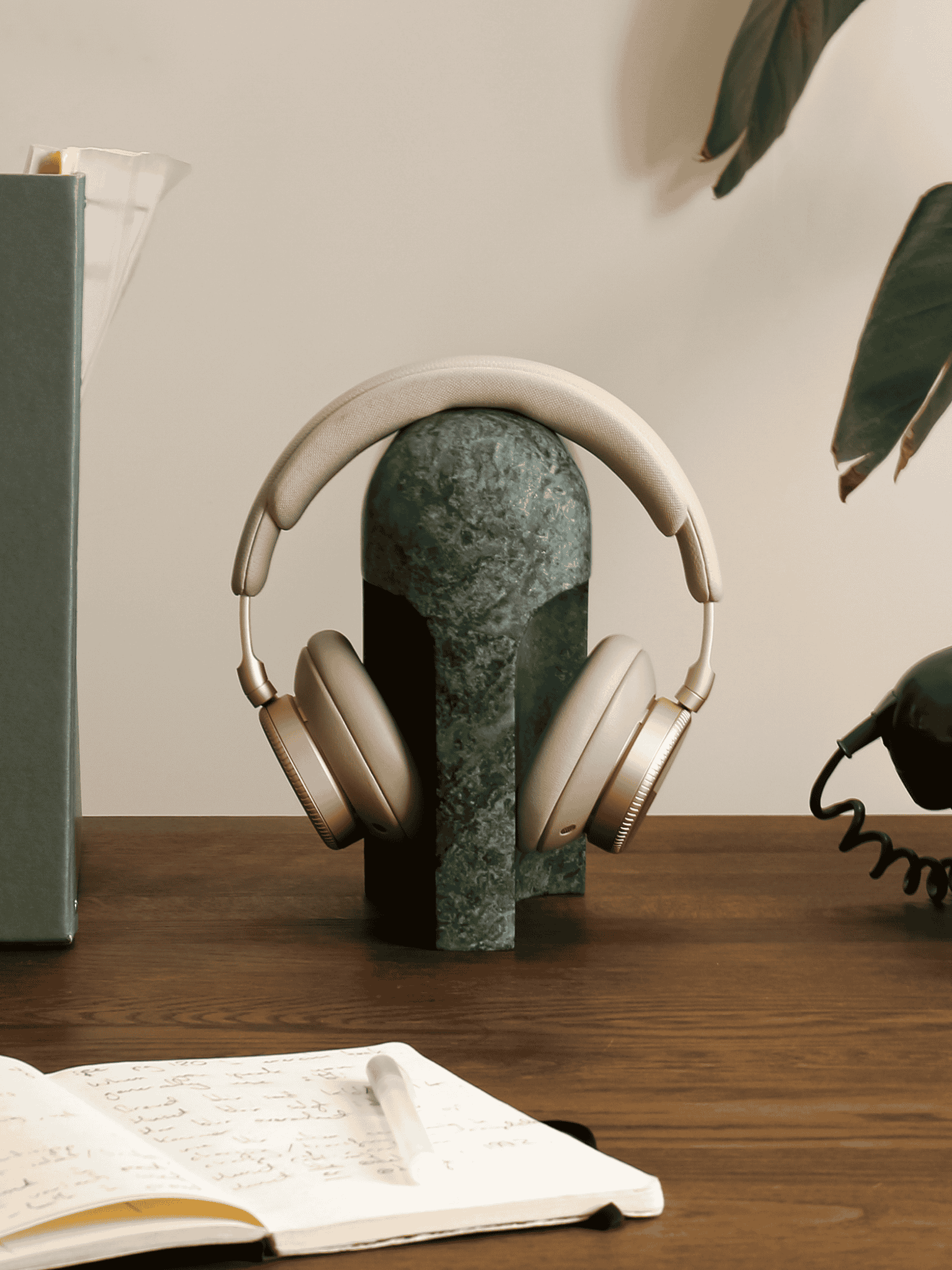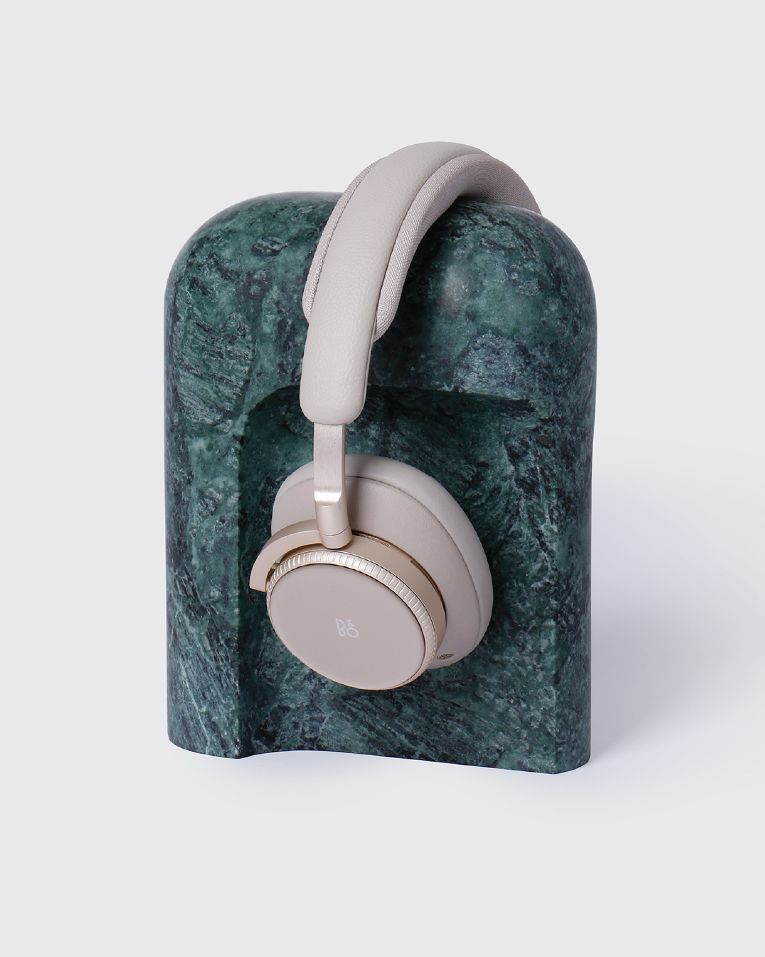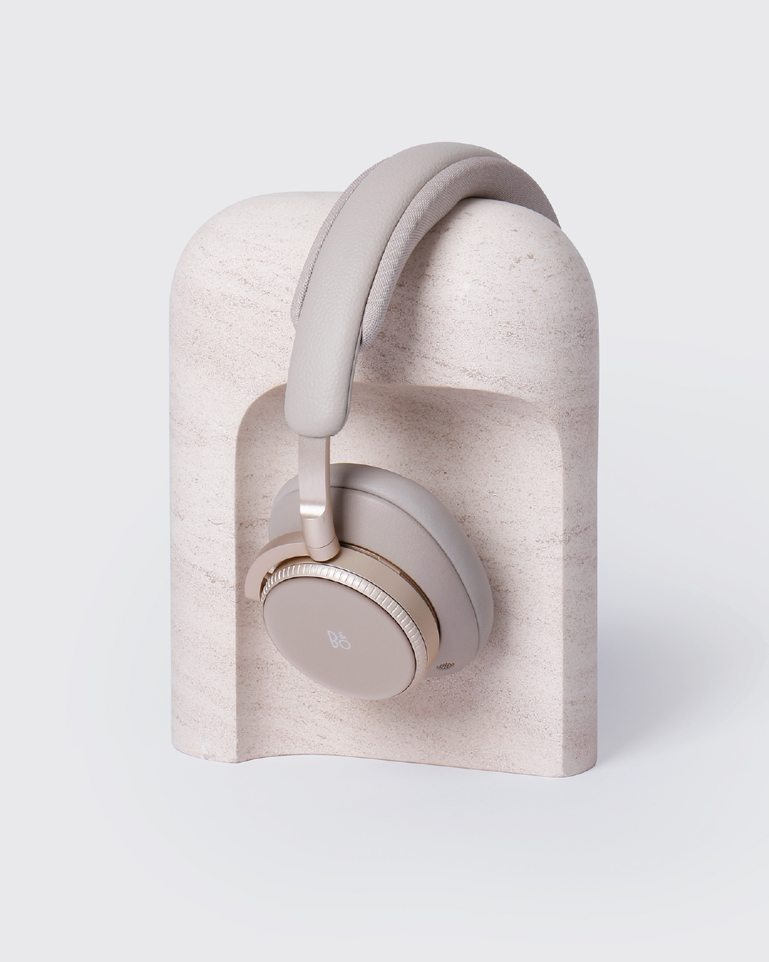 A peça vai além da função de suporte para auscultadores e aproxima-se de um objeto escultórico. A forma em arco define um ponto de apoio natural, pensado tanto para o uso como para a sua presença no espaço.