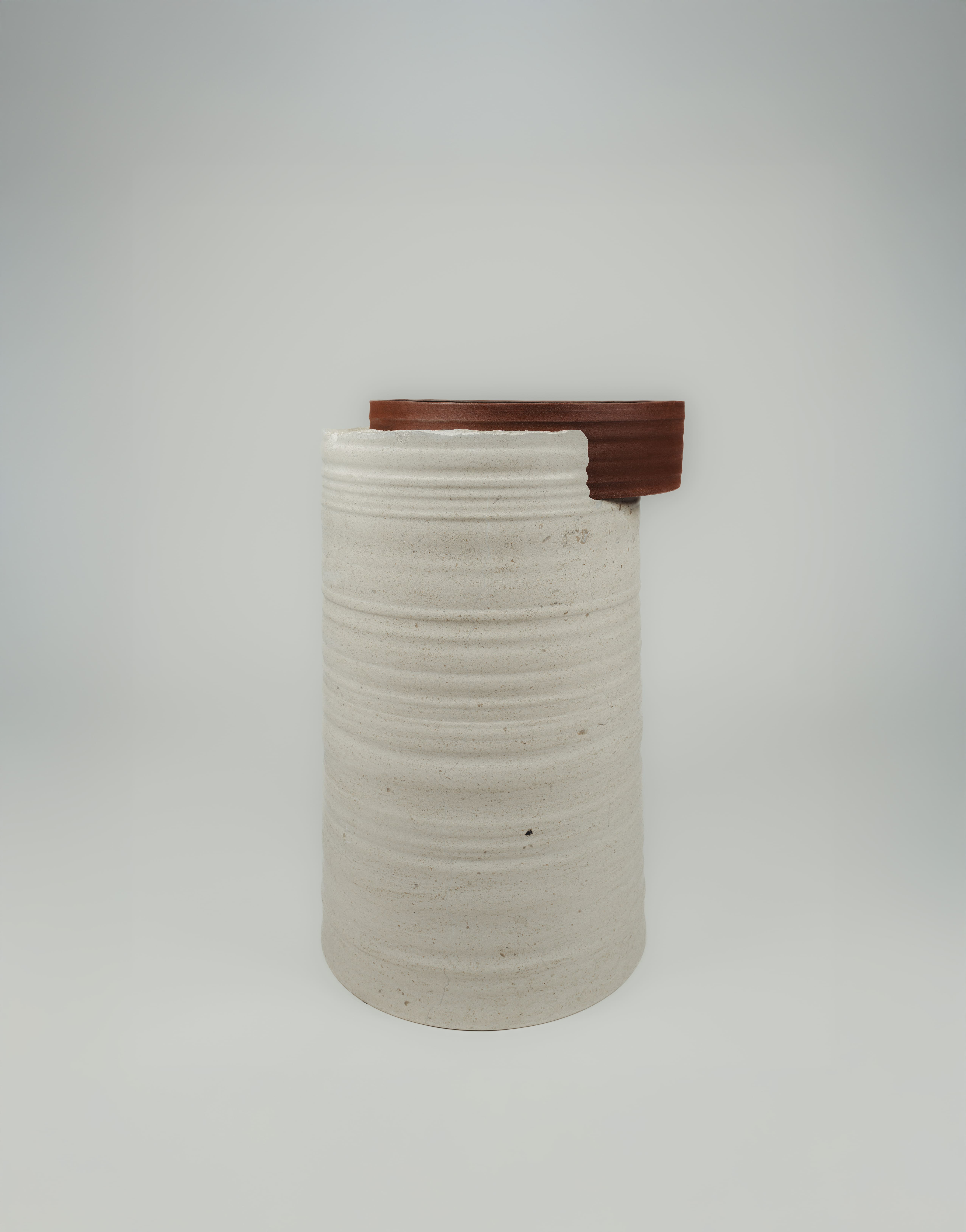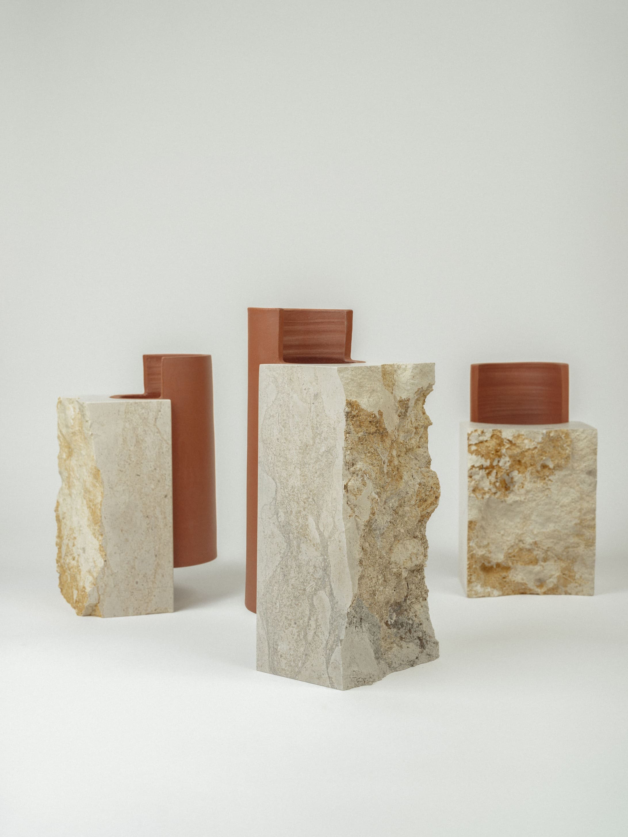 Produzida e curada pela Olivah, esta coleção enfrenta o desafio de unir dois materiais de natureza distinta. O calcário, fornecido pela Filstone proveniente da região de Fátima, conserva a sua rusticidade. O barro, trabalhado pelos artesãos da Casa da Olaria, inspira-se nas formas tradicionais para assumir usos inesperados.