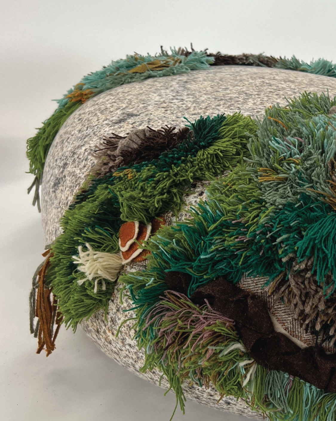 Nossa coleção é composta por uma poltrona, uma mesa de apoio, um banco, um quadro, um conjunto de vasos e um repousa pés. As peças evocam a dureza e permanência da pedra, equilibradas pela suavidade e proteção do tecido, criando uma linguagem visual que honra as formas naturais e a história material da Serra da Estrela.
