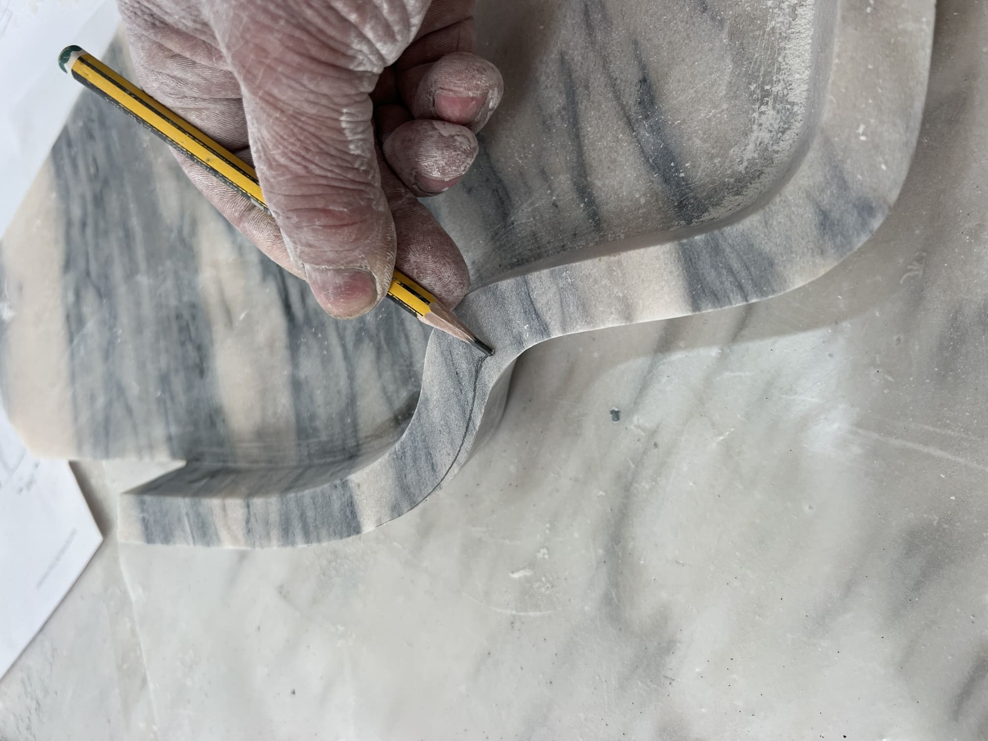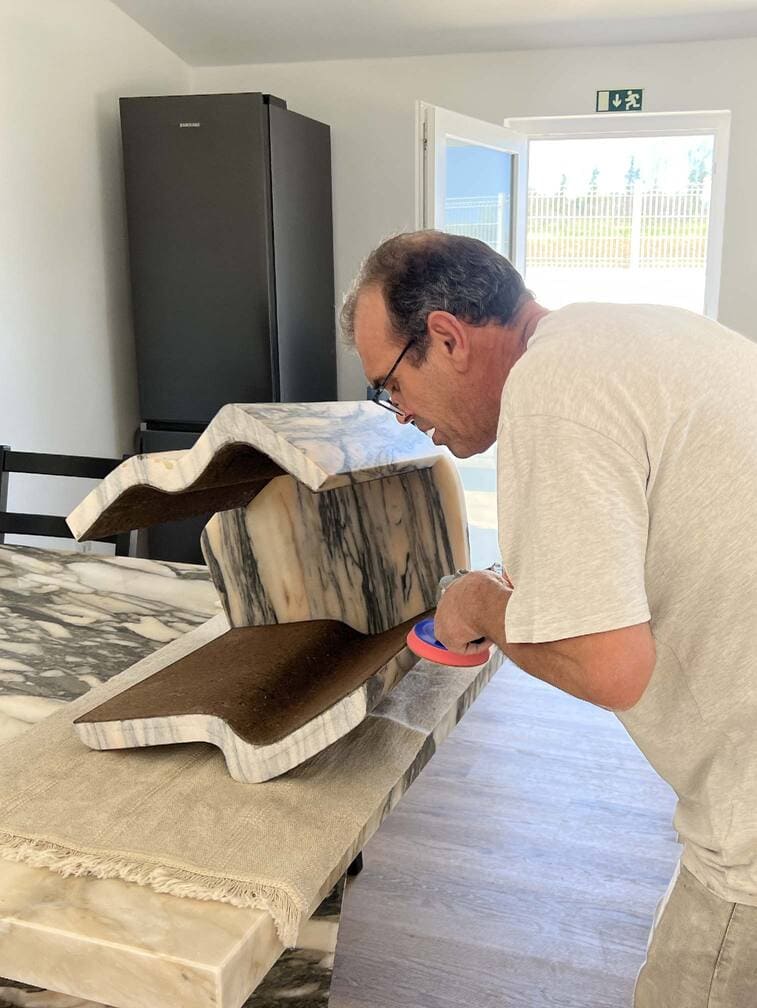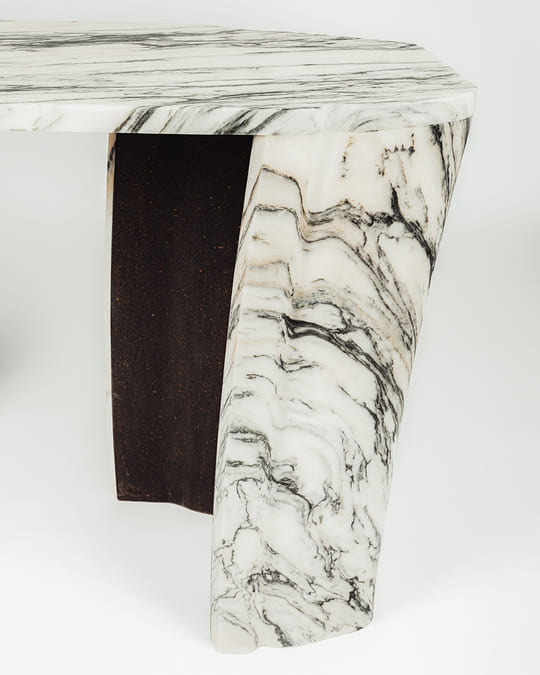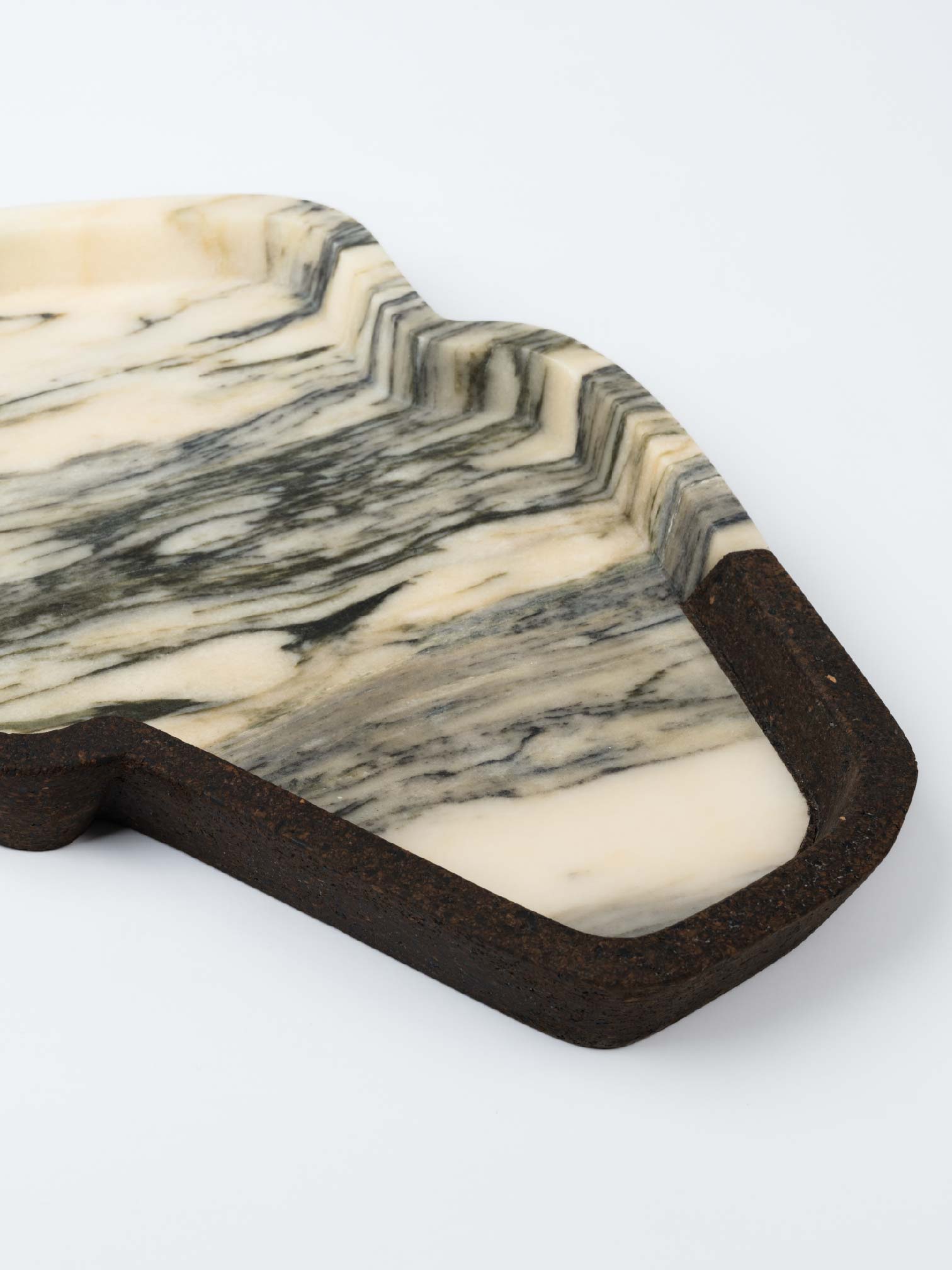 O mármore da região de Estremoz, fornecido pela Mármores Galrão, traz densidade e luminosidade às peças. A cortiça negra, fornecida pela Granorte e Sedacor, é transformada por um processo térmico intenso e adquire uma textura densa e escura, evocando o descortiçamento e as formas da paisagem alentejana.
