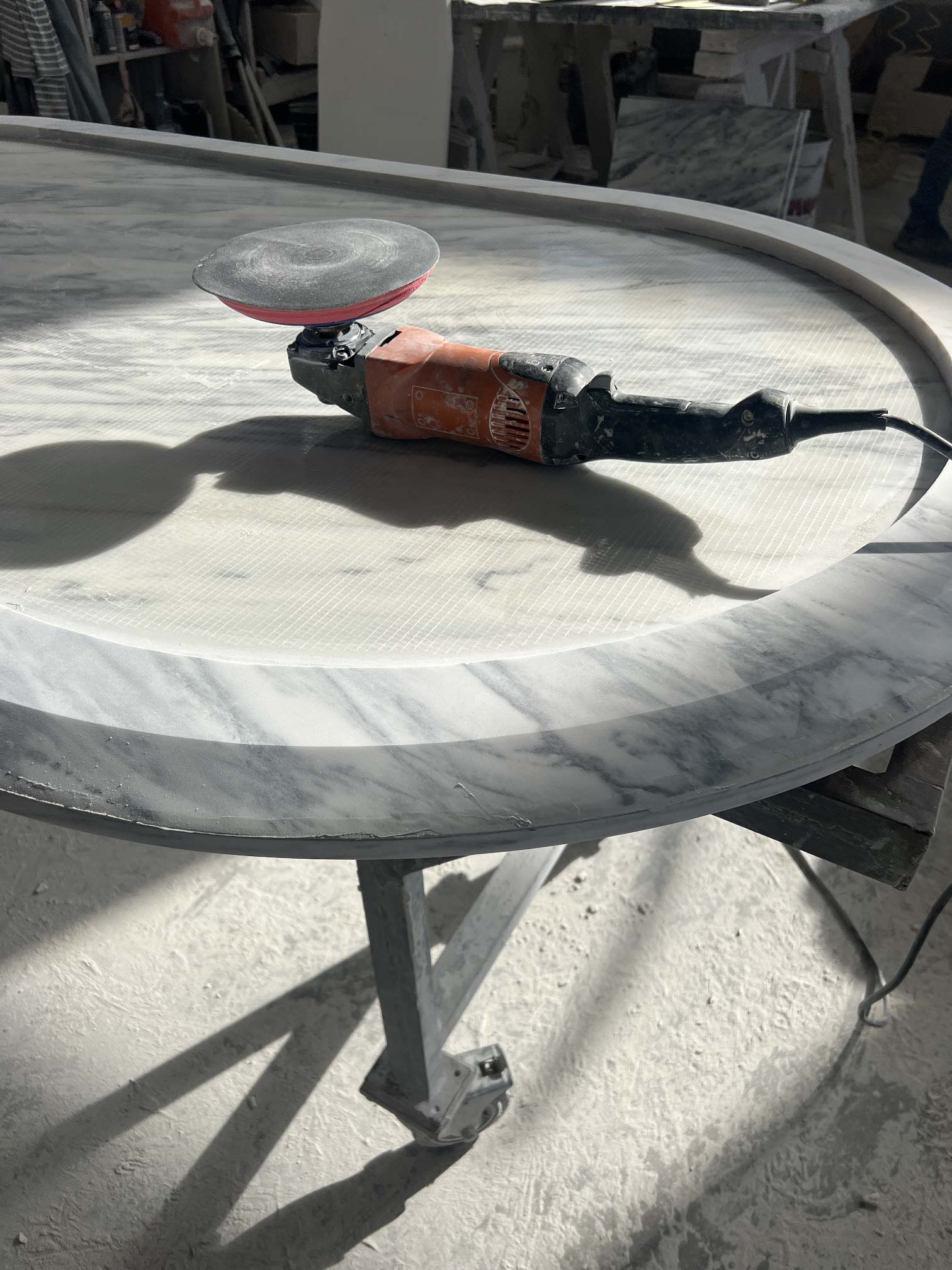 A peça foi produzida em mármore Pele de Tigre, com fundo branco e veios acinzentados, respeitando a paleta suave e a linguagem do ambiente. Cada detalhe foi trabalhado com atenção às proporções e à circulação, resultando numa mesa elegante, funcional e perfeitamente ajustada ao espaço da casa.