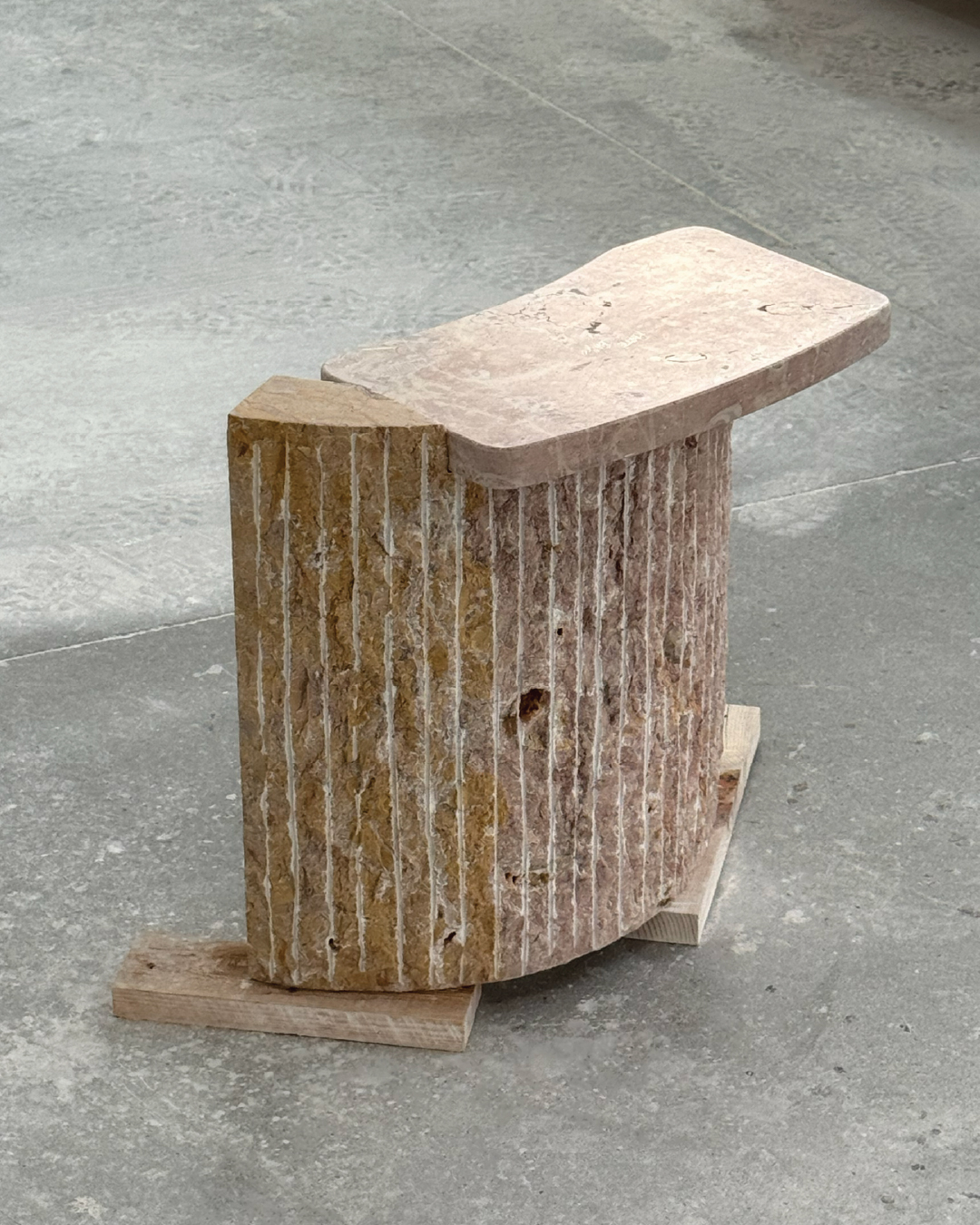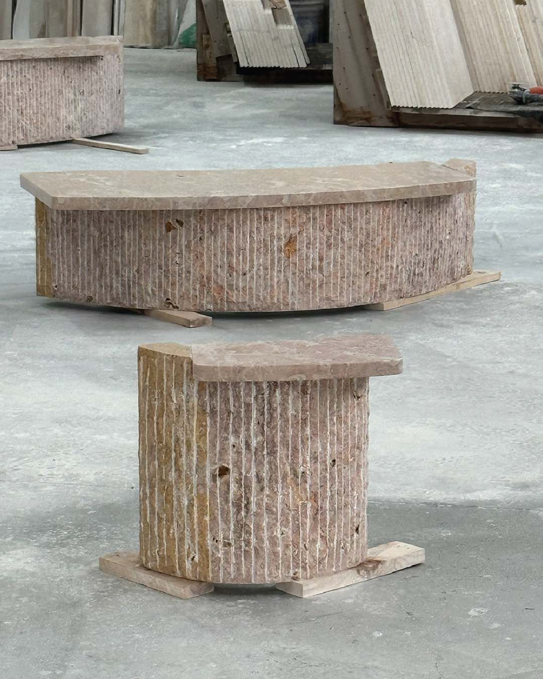 As peças — um banco, uma mesa auxiliar e uma mesa de centro — estabelecem um diálogo entredois estados do material. A base mantém se mais bruta, preservando as marcas do processo, enquanto as superfícies polidas revelam fósseis, sedimentação evariações minerais. Ao longo da coleção, a pedra permanece suspensa entre obruto e o refinado, sugerindo tempo e transformação.